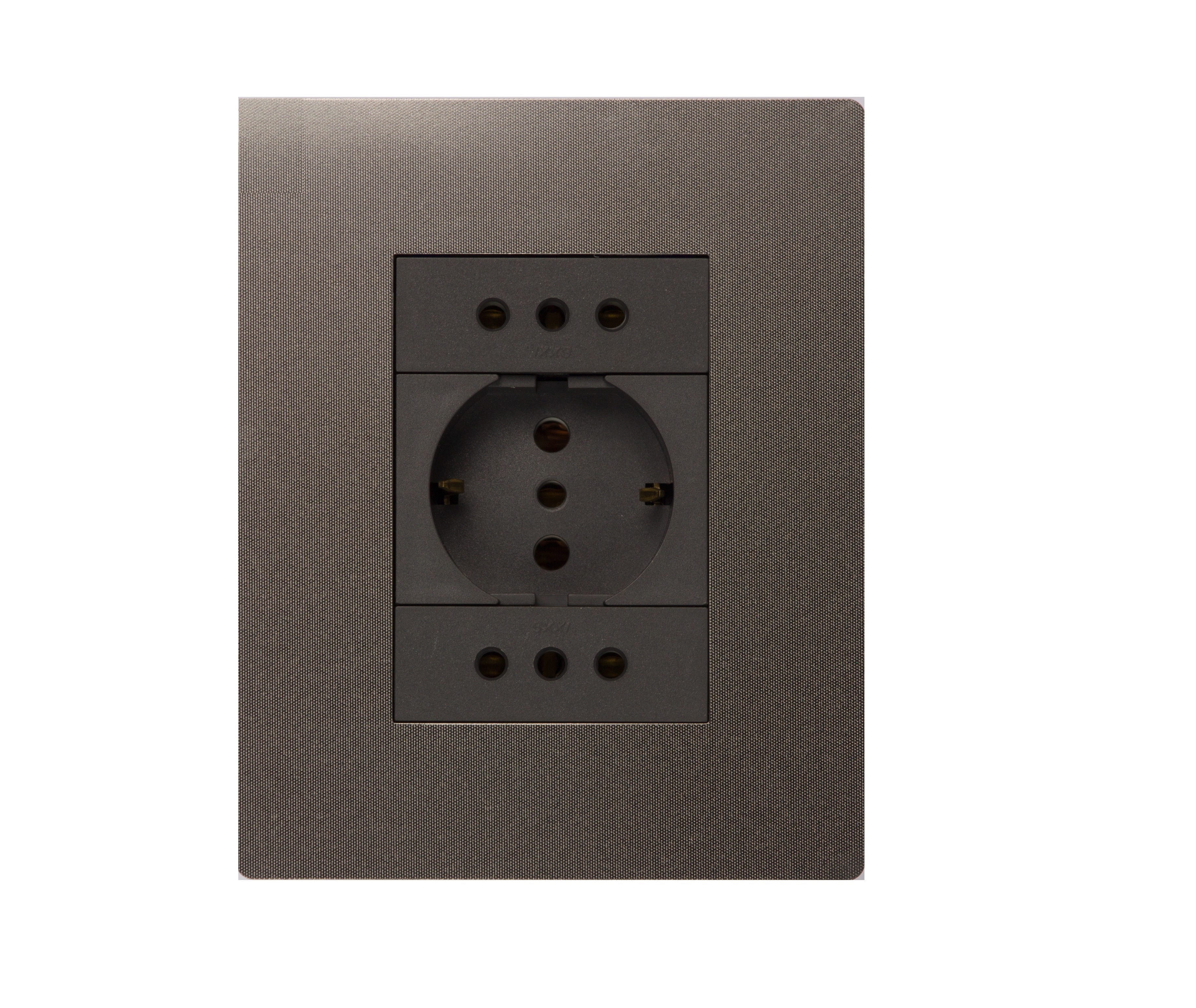 PLAQUETA MAGNESIO COD 4871 / BASTIDOR COD 6970 / 2 MOD. TOMA 3 EN LINEA CON SEGURO COD 7905 / MOD. TOMA SCHUKO COD 7917. OPCIONAL MODULO BLANCO